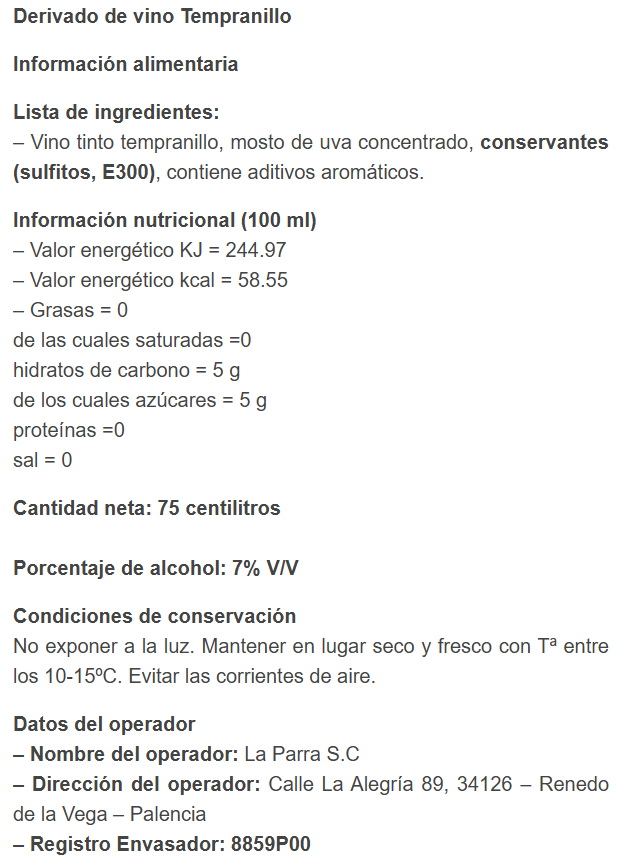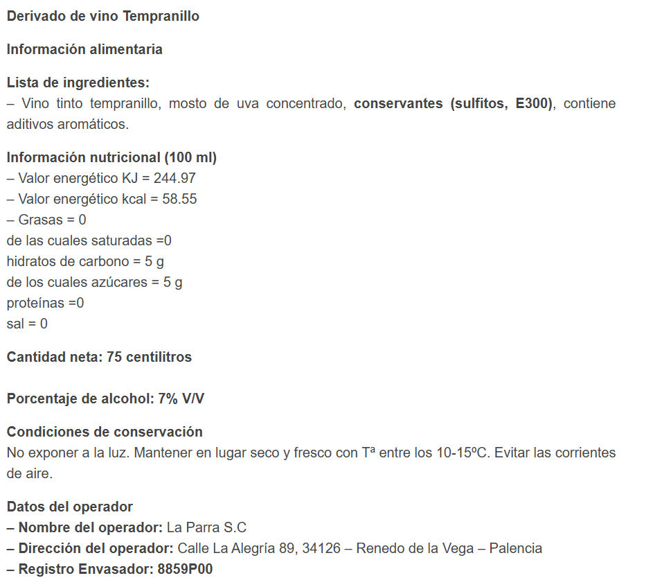 – Vino tinto tempranillo, mosto de uva concentrado, conservantes (sulfitos, E300), contiene aditivos aromáticos.